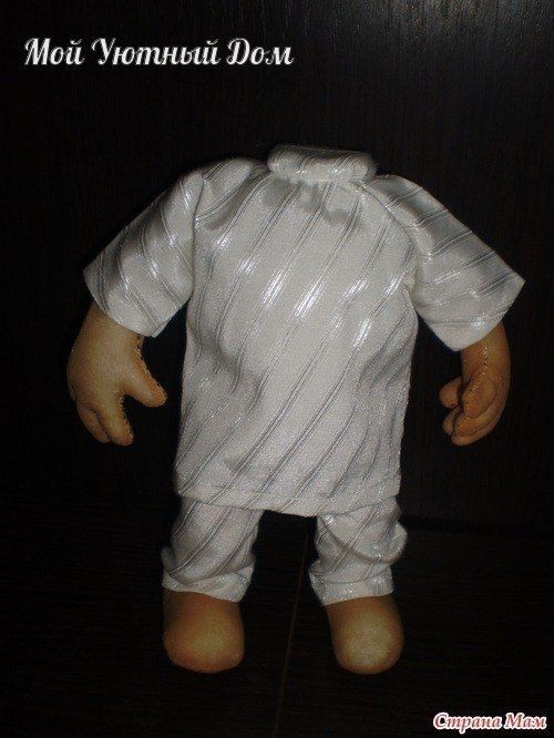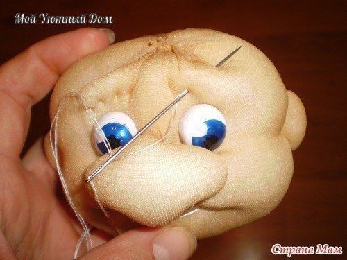 Глазки лучше всего делать из пуговиц. Сначала красим белым лаком.Затем лаками разных цветов рисуем зрачки.Пока сохнут глазки, займемся "натягиваением кожи". Для этого разрезаем капроновый носок в виде штанов и сшиваем, можно руками.Далее пришиваем глазки и выделям утяжками брови.