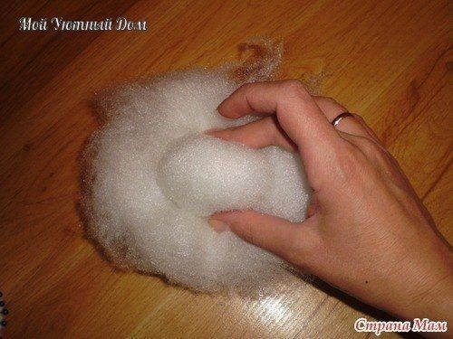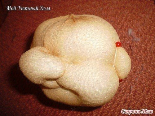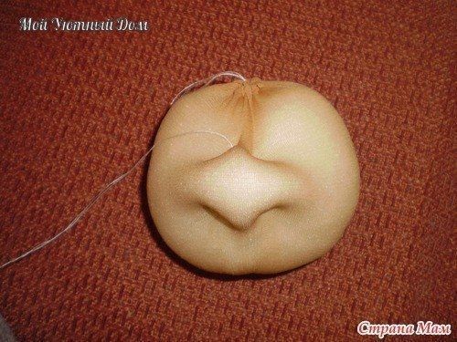 Тельце готово, приступим к изготовлению головы. Отрываем кусочки синетепона, формируем из него шарик нужного размера.Самой выпуклой частью является нос.Чтобы сгладить переходы, обматываем голову кусочком синтепона.Из капроновых носков вырезаем прямоугольник, приблизительно такого размера, как и шарик синтепона, присобираем его сверху и снизу. Далее намечаем, где будет нос. Чтобы мордашка была симметричной, намечаем места утяжек.С двух сторон утягиваем переносицу,Теперь надо сделать ноздри. Их лучше утягивать по диагонали...