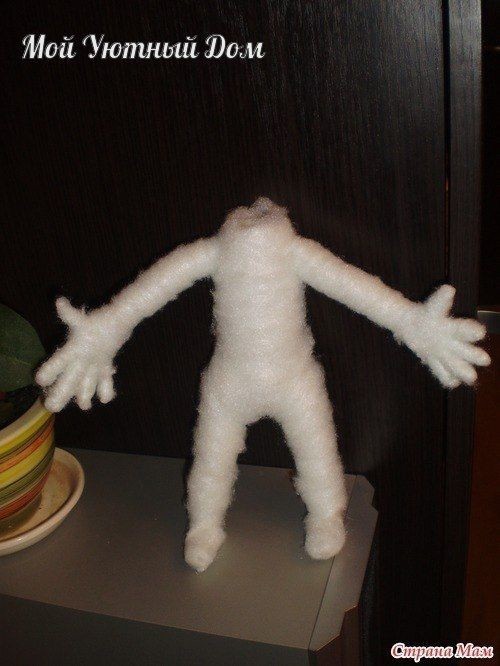 Теперь надо придать этому каркасу человеческие очертание. Нарезаем из синтепона ленты шириной около 2 см, тело и ручки чуть-чуть намазываем любым клеем (это чтобы синтепон не скользил и надежно держался) и аккуратно обматываем все части тела, включая пальчики.