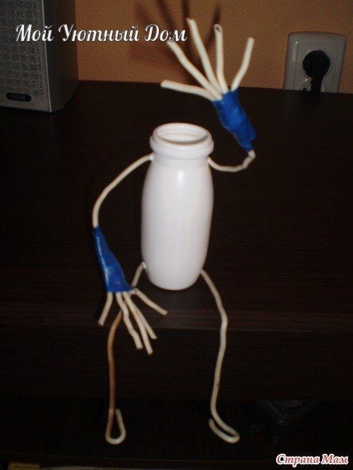 Нужен ли вам помощник на кухню? Если да, то давайте творить вместе.Итак, чтобы сделать куклу, необходим каркас. Есть разные варианты, но мне бутылочка из-под йогурта уж очень напомнила очертания тела. Итак, вооружаемся пластиковой тарой, проволокой и сооружаем следующую конструкцию.Нарезаем отрезки поменьше, подходящие для пальчиков и приматываем их к ручкам изолентой. Стараемся соблюсти пропорции и размеры пальчиков делаем разной длины.