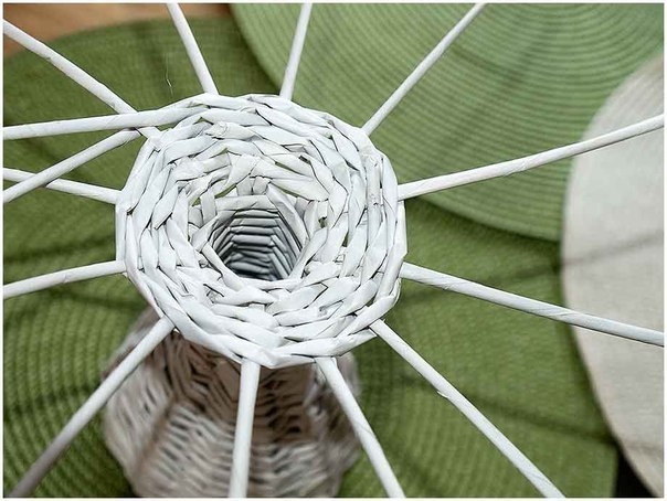 Нежные вазы из газетных трубочекНежные вазы из газетных трубочек словно парят в воздухе.Этому эффекту способствуют и форма, и белый цвет.