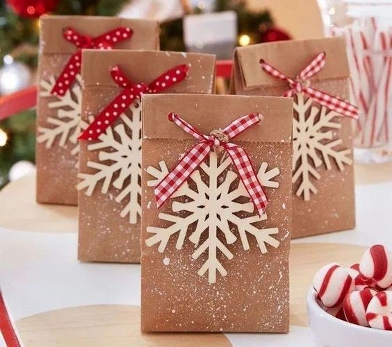 Экологичные способы упаковки новогодних подарков можно дополнить украшением как рисунками, так и кружевом.