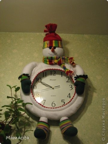 Собрала все воедино и у меня получился вот такой снеговик на часы.