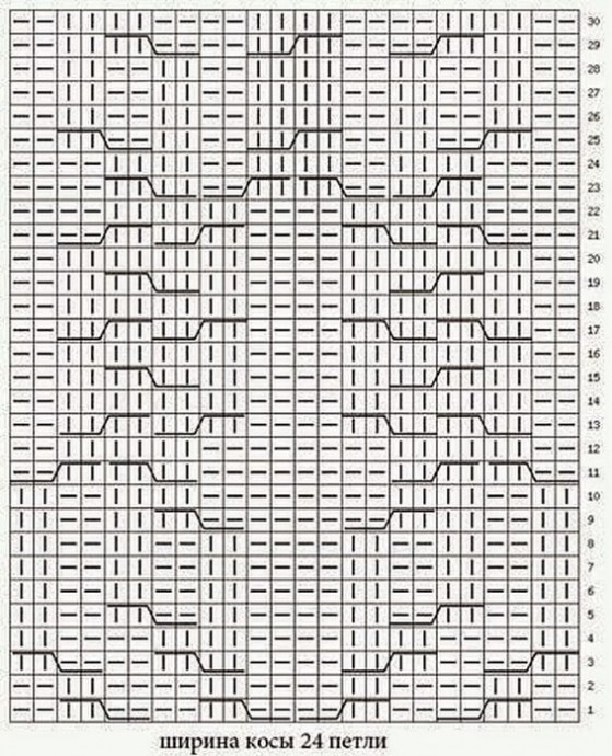 Узор состоит из лицевых и изнаночных петель, которые перекрещиваются друг с другом.