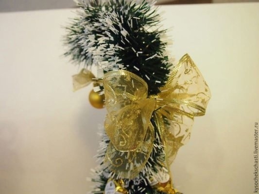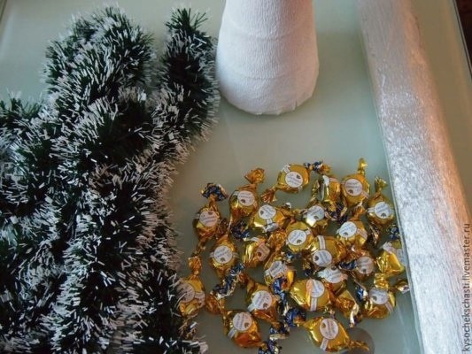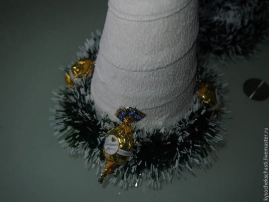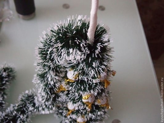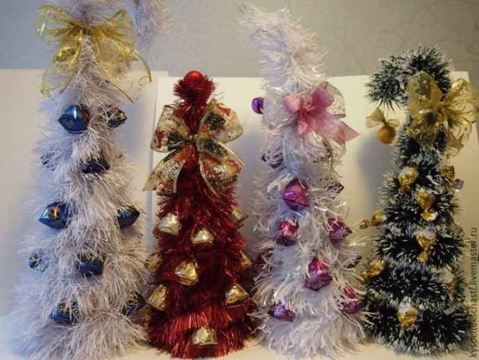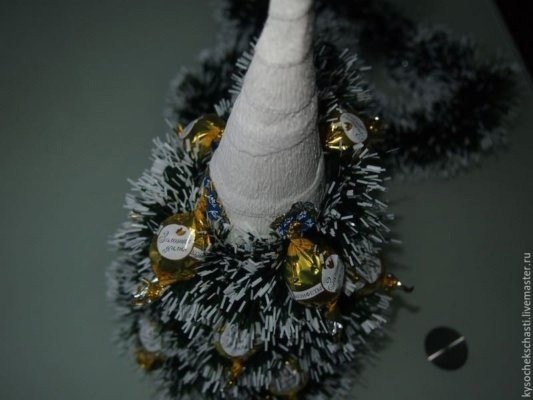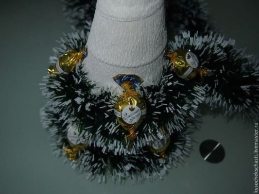 Делается легко, мастерим конус и начинаем наматывать дождик любимого цвета, приклеивая по пути конфетки, вершинку украшаем бантом.