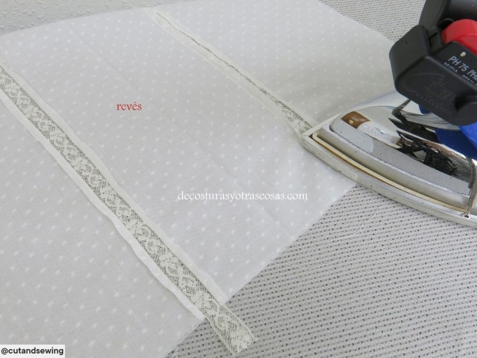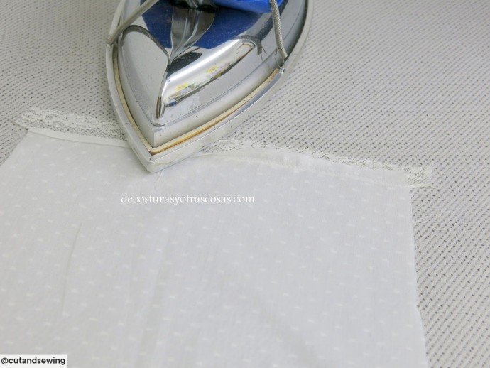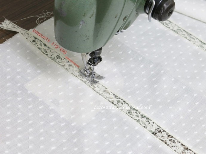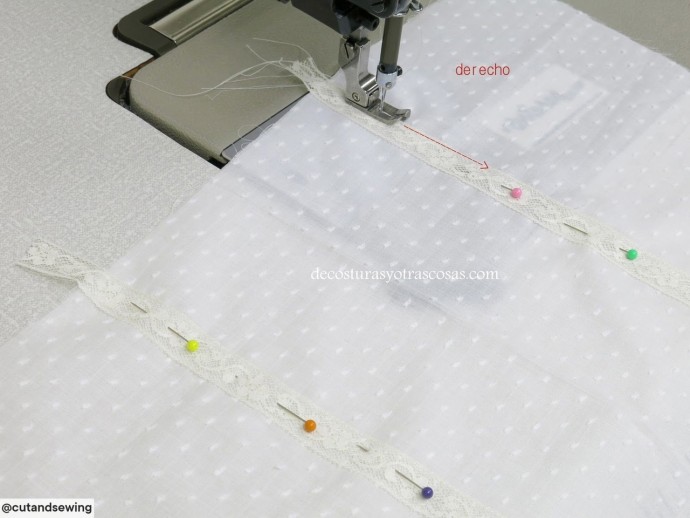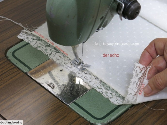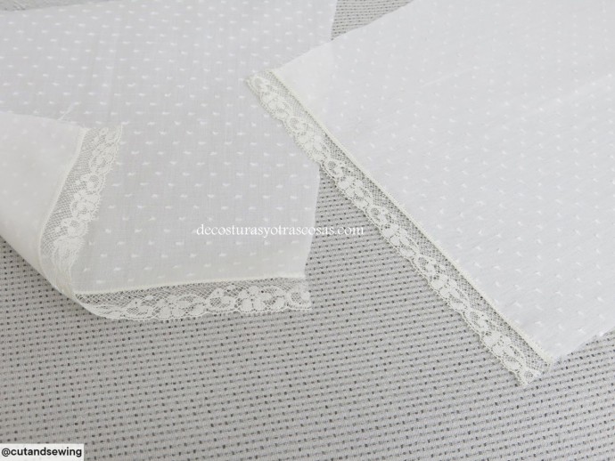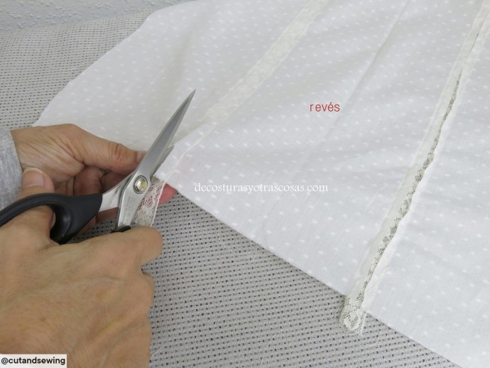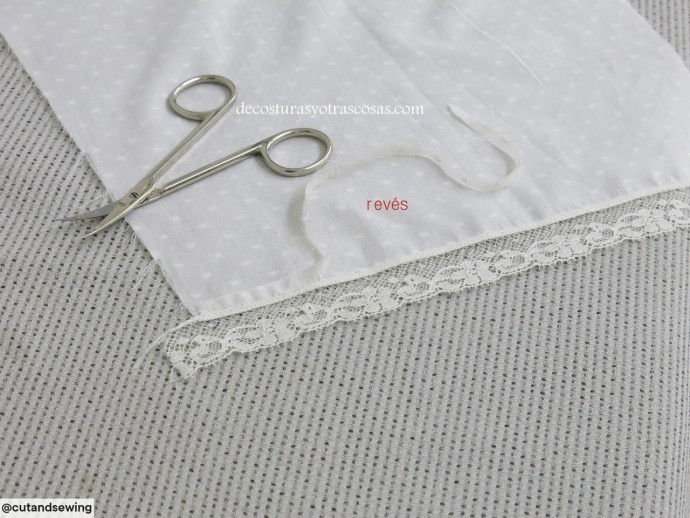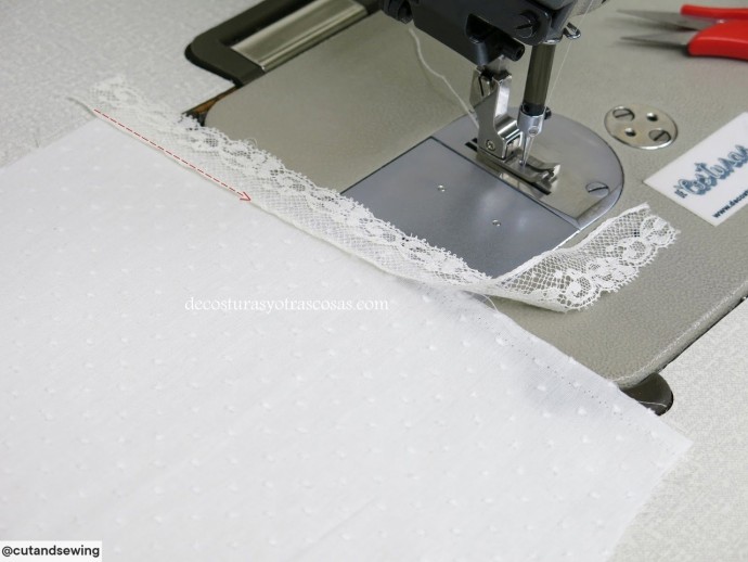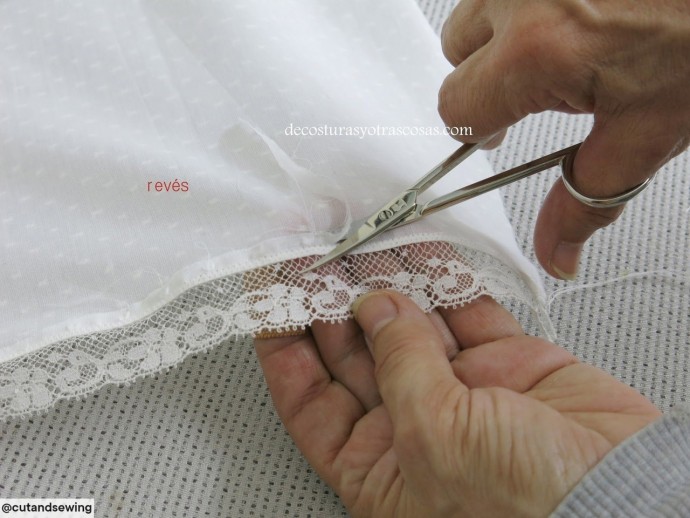 Если материал не сыпучий, можно его заранее разрезать на полосы, а не расстригать под пришитым кружевом.