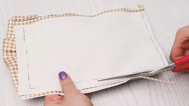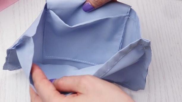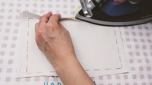 Вырежьте из подходящей ткани два прямоугольника примерно 15 на 20 см и укрепите их дублерином. Обведите на изнаночной стороне половину листа формата А 4. Верхний припуск на шов заутюжьте вовнутрь. Теперь нужно закрыть концы молнии. Два небольших квадрата ткани, со стороной чуть шире двойной ширины молнии, согните пополам лицом внутрь и прострочите (синий шов).