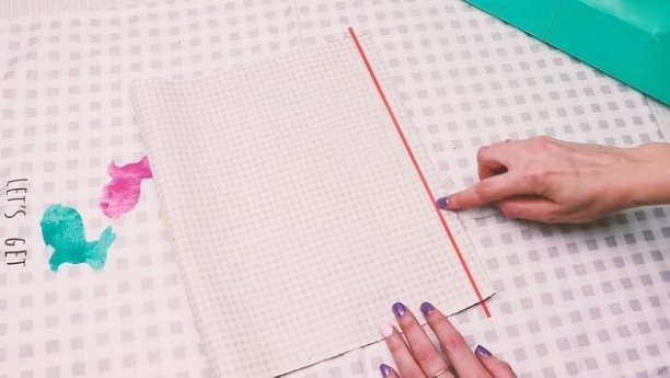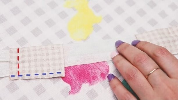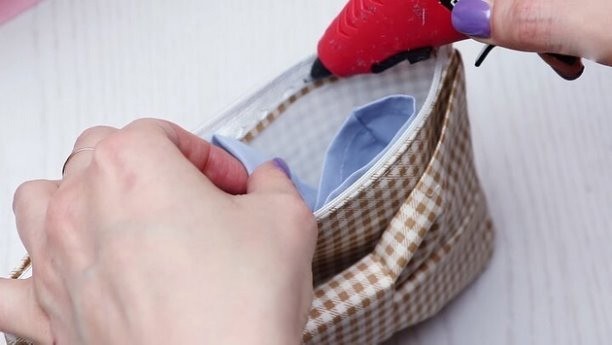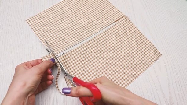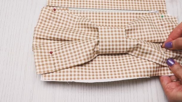Вложите внутрь получившейся «трубы» концы молнии и проложите строчку по короткой стороне (красный шов). Выверните ткань, полностью закрыв концы молнии, и отутюжьте. Пристрочите близко к молнии заглаженные края заготовок. Аккуратно обрежьте всю выступающую ткань. Чтобы сделать бант, возьмите прямоугольник ткани примерно 29 на 49 см. Сложите пополам и проложите шов. Получившуюся деталь выверните и прогладьте. Заложите две встречные складки к центру так, чтобы ширина заготовки была равна половине листа формата А 4. Прострочите прямоугольник по коротким сторонам по самому краю, чтобы зафиксировать складку. Небольшой прямоугольник ткани сложите вдоль пополам лицом внутрь и прошейте по длинной стороне. Выверните, прогладьте и сшейте два конца, замкнув в кольцо. Протяните сквозь него заготовку банта, чтобы получилась перемычка. Разложите бант на одной из сторон будущего клатча. Зафиксируйте булавками. Сложите заднюю и переднюю части сумочки лицом к лицу и прошейте по трём сторонам. Выровняйте периметр, обрезав всё, что торчит. Сумочку выверните и расправьте. Сделайте подкладку, сшив по трём сторонам два прямоугольника и прикрепив к ним карман. Края деталей нужно заранее подогнуть по краю и отстрочить. Вложите подкладку внутрь клатча и подклейте на клеевой пистолет. Модный маленький клатч готов.