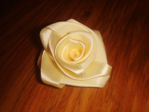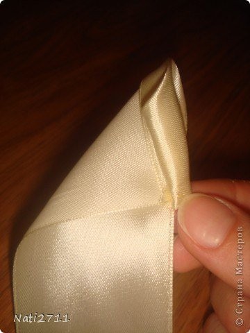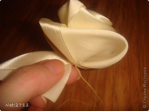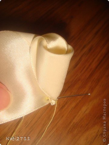 Топиарий из атласных роз не требует обработки края при создании роз, так как края лент уже обработаны.