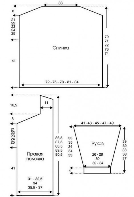 Спинка: На спицы № 8 набрать 81 (85) 87 (91) 95 п. и вязать изнаночной гладью. Для пройм через 41 см от начального ряда отметить маркером или нитью контрастного цвета кром. с обеих сторон. Для плеч через 62 (63) 64 (65) 66 см от начального ряда закрыть с обеих сторон 1 раз по 3 п., в каждом следующем 2-м р. 1 раз по 3 п., 4 раза по 4 п. (1 раз по 4 п., в каждом следующем 2-м р. 5 раз по 4 п.) 1 раз по 4 п., в каждом следующем 2-м р. 4 раза по 4 п., 1 раз по 5 п. (1 раз по 4 п., в каждом следующем 2-м р. 2 раза по 4 п., 3 раза по 5 п.) 1 раз по 4 п., в каждом следующем 2-м р. 5 раз по 5 п. Через 70 (71) 72 (73) 74 см от начального ряда закрыть оставшиеся 37 п.