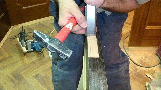 ножовка, столярный молоток, стамеска. Соответственно, ножовкой нужно будет аккуратно сделать пропил на ширину выступающей части профиля, а затем стамеской при помощи молотка просто отколоть ненужный кусок профиля и зачистить поверхность. Крепление производится аналогично саморезами под углом 90 градусов.