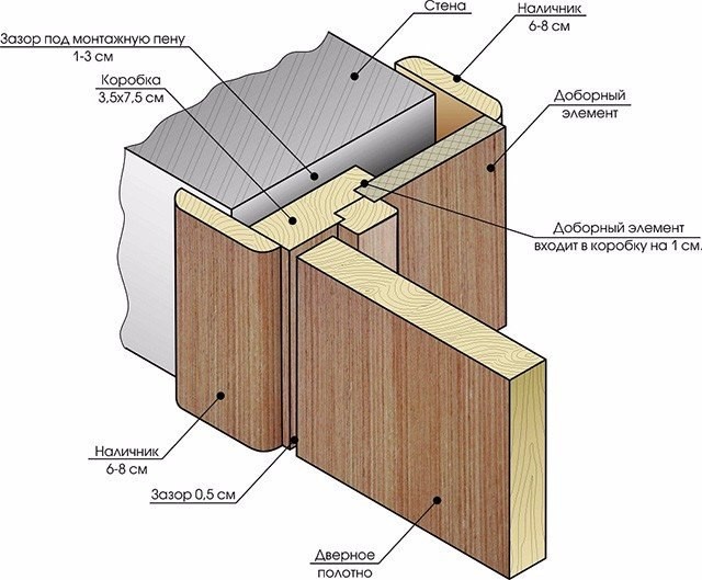 В этом случае горизонтальный профиль дверной коробки будет ложиться на вертикальный. Соответственно, размеры вертикальных брусьев будут определяться как высота самой двери плюс пара зазоров величиной по 3 мм сверху и снизу.