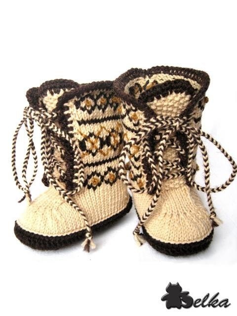 Вязаные уггиЧем толще пряжа, тем теплее получатся сами угги.Можно пришить подошву от старых тапочек.