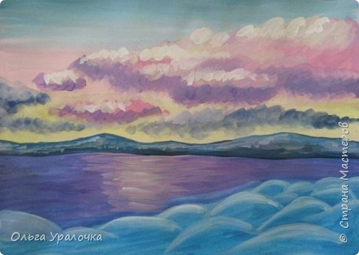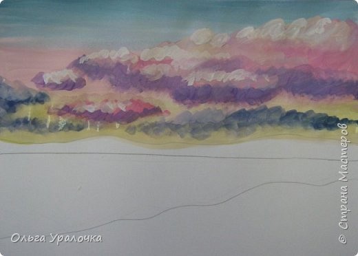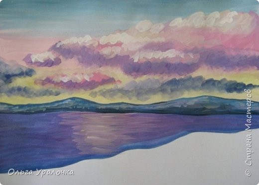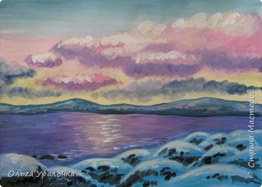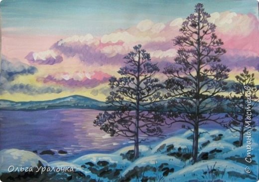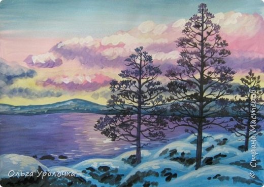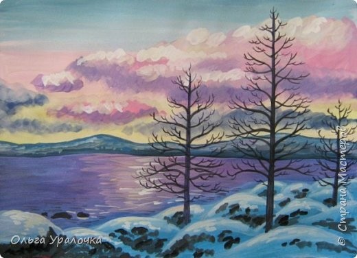 Зимний пейзаж на фоне озера это умиротворенность и покой, которыми можно напитаться через рисунок.