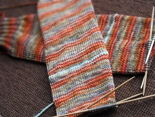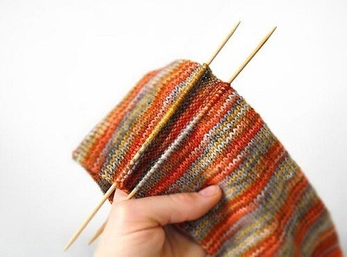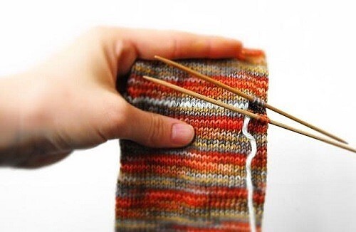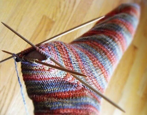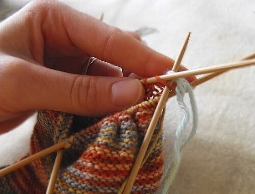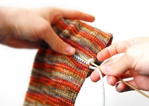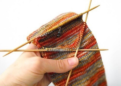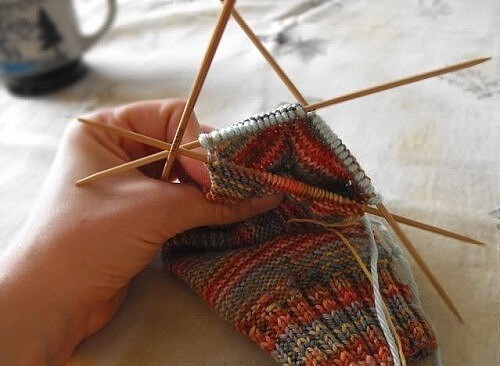 Вяжем носок на чулочных спицах от резинки до пятки как обычно. Затем поступаем следующим образом: на спицах, на которых предполагаете вязать пятку, вплетаем нить контрастного цвета. Этим мы отметили место, где будем в дальнейшем вязать пятку. Далее возвращаем вязание назад на 4 спицы и продолжаем довязывать носок как обычно, но без пятки. Когда носок закончен, возвращаемся к пятке. Аккуратно удаляем контрастную нить, а петли одеваем на спицы и формируем пятку. Вот и все. Чтобы перевязать протертую пятку, надо всего лишь ее немного распустить и нет необходимости заниматься всем носком.