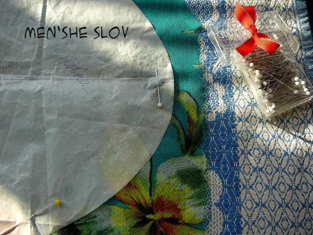 Видно, что на столе хлопчатобумажное покрывало. Перпендикуляр выставляется по краям стола, сначала накалываем булавками, потом примётываем вдоль. Все стороны к покрывалу. И больше ничто никуда не сместится.