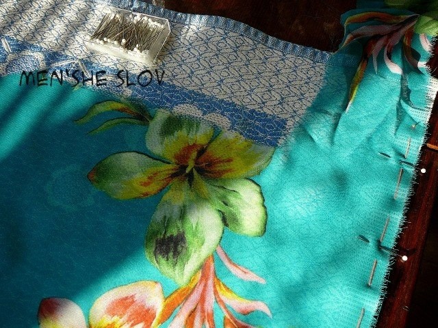 А нужно было его к столу "пришить". Край вспомогательной ткани разложить на столе так, чтобы кромка шла вдоль длинной стороны. И с этого угла ближнего сверху разложить поверху кромку шелка точно так же. Наколоть кромку шелка на кромку костюмной. Далее выложить перпендикуляр, уток ткани. Тоже наколоть. И ниткой с иголкой наметать отрез шелка на костюмную. По кромке и отрезу. Потом можно всё передвинуть по столу. Они сшитые, никто никуда не сдвинется. Подвинули, и намётываем другую кромку. Ширина костюмной не менее 140 см, для шелка хватит, чтобы наметать вразворот. Зато ничего не елозит. Метод - супер, только так крою шифоны и шелка, и нервы целее.