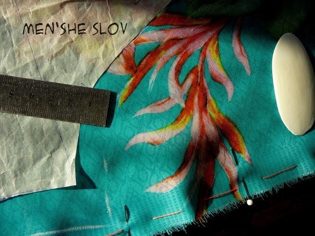 2. Шелк не любит мела. Я не скажу, что я не крою мелом его, но нужно с ним осторожнее, может процарапать и повредить ткань. Или песчинки попадаются. В этом случае лучше брать тонкий обмылок, но не всякого мыла, а такого, которое в составе имеет мало жиров. Детское мыло не пойдёт, оно оставляет жирные полосы. Увлажняющие, питательные - тоже нет. Лучше всего брать для раскроя такое мыло, на котором написано "очищающее". Оно и линию даёт яркую, чёткую. Попробуйте подобрать.