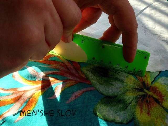 Зелёная - правильная. Смотрите, держу полотно линейки под углом градусов 75. Прижимаю край выкройки, вдоль которой нужно прочертить линию. Тем самым фиксирую шифон в этом месте, и он под мылом не двигается. Только обмылок нужно остро заточить. И участками, прижала - прочертила. Это быстро.