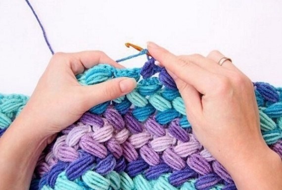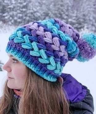 Освоить этот узор совсем не сложно. В моду давно и прочно вошли объемные шапки. В них тепло и комфортно, и они гармонично смотрятся с верхней одеждой. Эта шапочка связана из пряжи нескольких цветов холодных оттенков: голубой, фиолетовой, синей и сиреневой. Шапка заканчивается разноцветным помпоном. Для вязания шапки вам потребуется крючок №3,5. Большой расход пряжи для шапочки, компенсируется тем что изделие получается очень теплым. Если укрепить шапку подкладом, то её можно носить даже зимой.