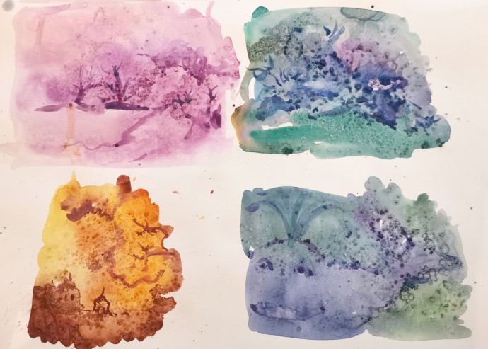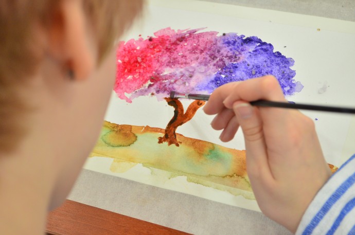 Действительно, акварель с солью – это очень доступная и совсем несложная техника, как может показаться на первый взгляд. К тому же, она еще интересная и необычная, одна есть несколько нюансов, которые нужно знать, чтобы все точно получилось. Соль можно использовать и крупную, и мелкую. Рассыпанная по листу бумаги с краской, она как бы «съедает» акварель, образуя при этом очень красивую и необычную фактуру. Важно насыпать соль на первый, свежий слой краски, который еще не высох. После же высыхания можно убрать частички соли с бумаги сухой кисточкой.