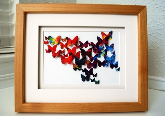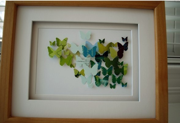 Когда определитесь с окончательным вариантом, садите на двусторонний скотч. Совет: чтобы сделать композицию более живой, сделайте как бы ярусы – между бумагой и бабочкой вставьте немного поролона, и опять на скотч.