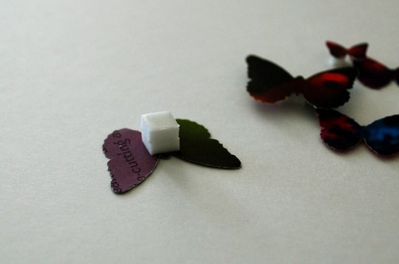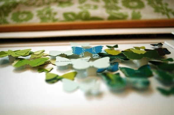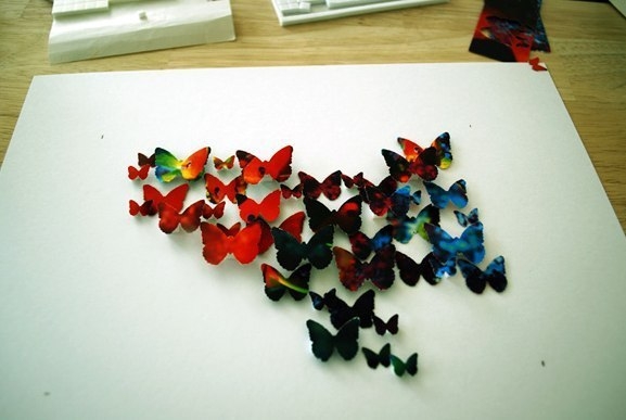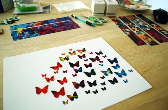 Попробуйте вырезать разной ширины бабочек, это намного разнообразит композицию. Разложите примерную композицию, пока без скотча.