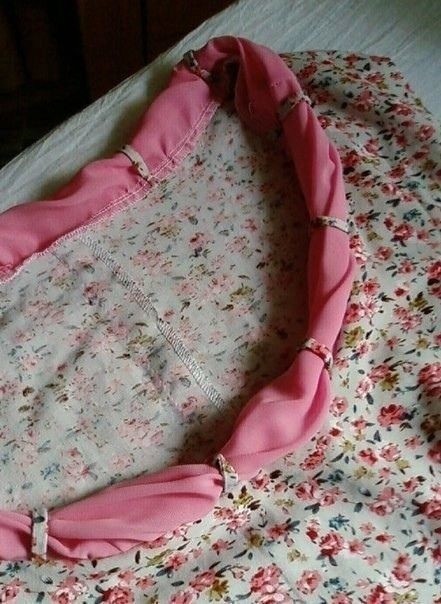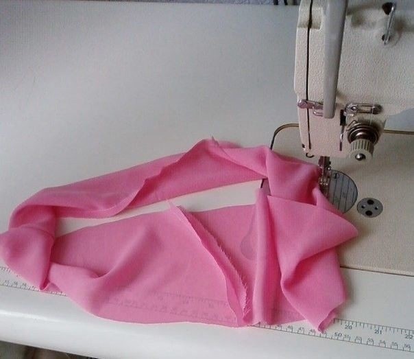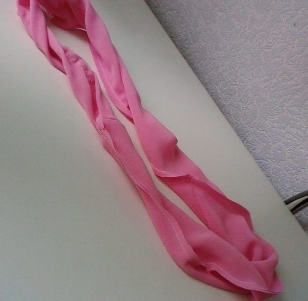 Горловину обработала шифоном, чтобы оживить маленько — без розового акцента платье было никакое…Так вот, хочу показать как ваяла этот шифоновый жгутПолоску шифона выкроила по косой. Шифона тоже было маловато, поэтому полоска имеет аж три щва. Сшила ее в кольцо.