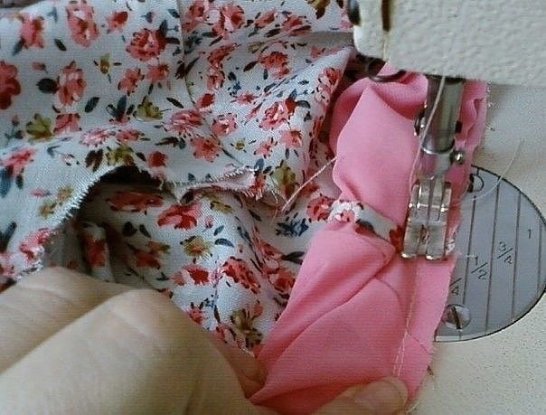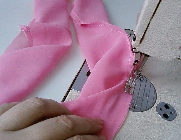 Потом сложила срез к срезу со значительным, ок. 5-7см , смещением, простпрочила на 0,5 см от среза. Получилась такая колбаска. Прикрепленное изображение Прикрепленное изображение К срезу горловины пристрочила шлевки из основной ткани, потом приколола шифоновую деталь и прострочила на 0,7 см от среза. С первого раза получилось как-то бедновато, поэтому шифон припосадила — так гораздо лучше, косые заломы ложатся красивее.