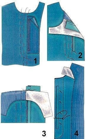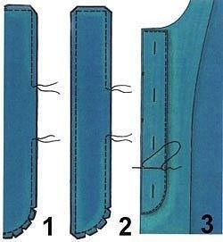 Вход в застежку отсрочите по переднему краю в край. Припуски шва притачивания по другому краю входа в застежку разутюжьте. Полосой подкладочной ткани обогните припуски шва и приметайте полосу в виде канта так, чтобы она заполнила разрез входа в застежку. Кант настрочите точно в шов притачивания (2) или пришейте вручную мелкими стежками шва «назад иголку». Маленькие треугольнички на концах разреза притачайте к канту (3).