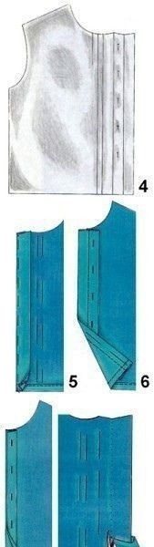 Правый крау застежки: передний край заметайте на изнаночную сторону по линии правого сгиба и приутюжьте (5). Обметайте петли. Передний край заметайте на изнаночную сторону по линии цельнокроеного подборта. Край приутюжьте и отстрочите по разметке (6). Планку с петлями отогните вдоль строчки и приутюжьте к переднему краю (7).