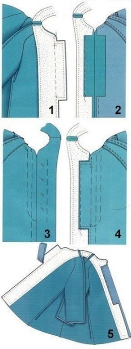 На левой полочке сколите передние срезы по линии левого края. Срезы стачайте. Припуски швов срежьте близко к строчке и. соответственно, срежьте цельнокроеную планку вдоль левого борта (5). Подборт отверните на изнаночную сторону, края приутюжьте. На правой полочке удалите сметочные стежки по переднему краю. Передние срезы планки между петлями сшейте вручную парой стежков.