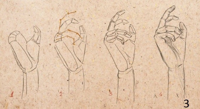 Один из эффективных и чаще всего используемый способ изображения руки в нестандартном ракурсе, это обозначение линии положение каждого пальца (Рис. 2)