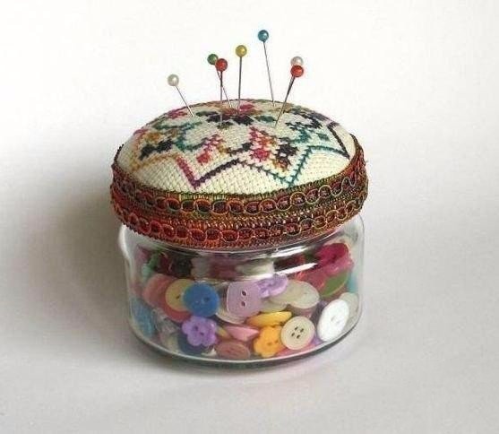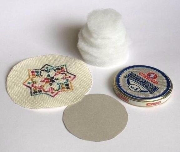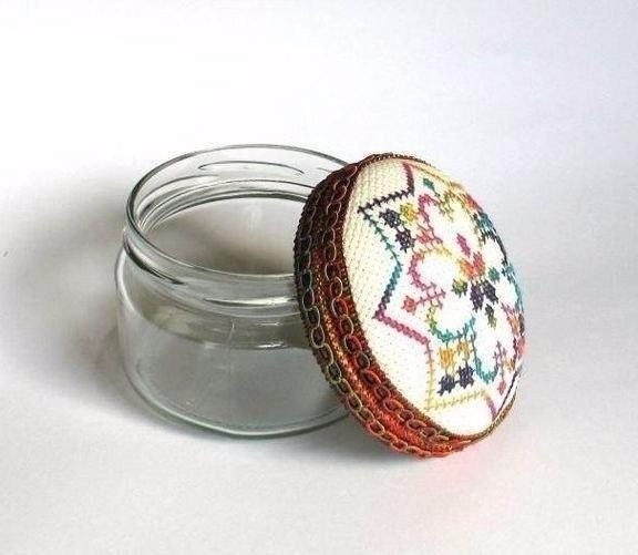 Игольница с вышивкой создается из баночки с дополнением из прослойки синтепона для объёма.