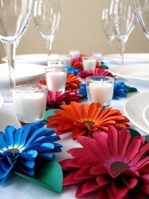 Крупные цветы из бумаги отлично подойдут, чтобы украсить стол к празднику.