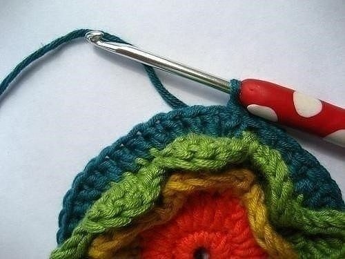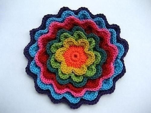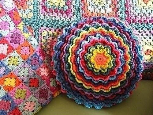 Подушка в виде разноцветного цветка вяжется крючком и обладает маленьким секретом: у нее есть массажный эффект, если прилечь на ней поспать днем.