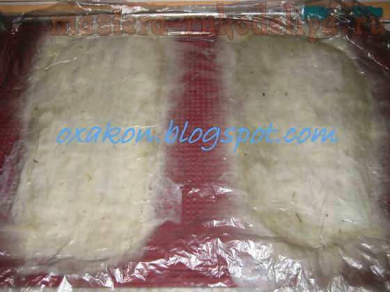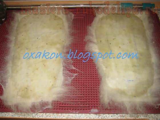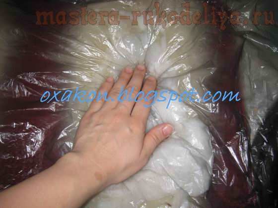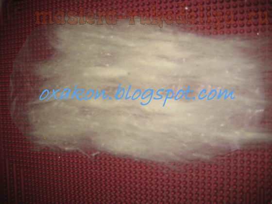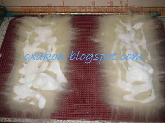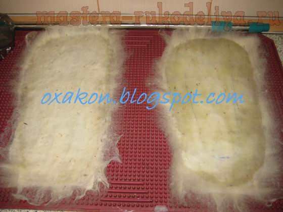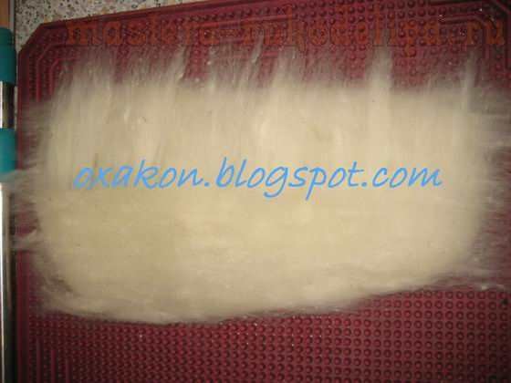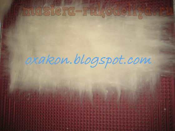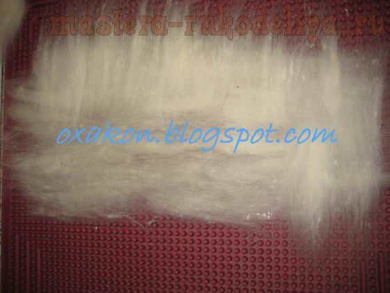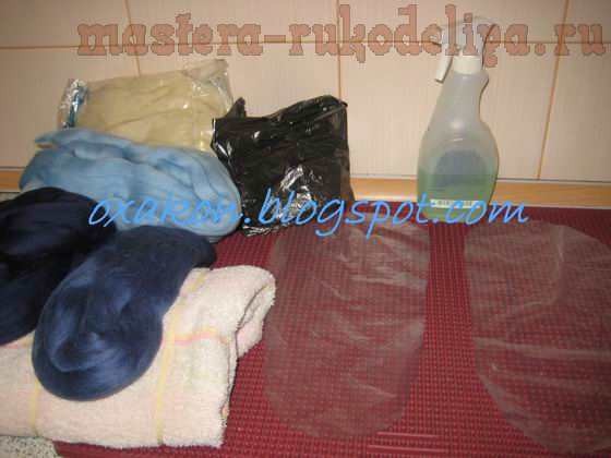 Мочим мыльной водой достаточно интенсивно, чтобы все слои шерсти хорошо пропитались. Сверху закрываем пленочкой (или сеточкой) и тихонько прижимаем руками от середины к краям, чтобы окончательно шерсть пропиталась мыльным раствором и вышли пузырьки воздуха. Слегка притираем, поглаживая, чтобы шерстка первоначально сцепилась между собой.