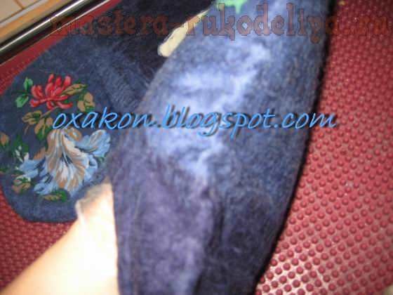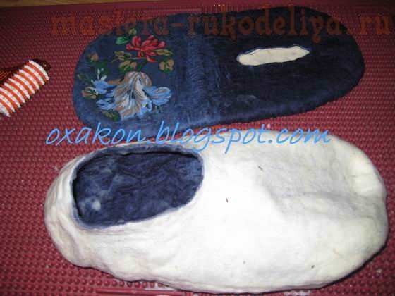 Далее занимаемся самим валянием - мнем тапочек, жамкаем (как тесто). Получается вот такая разница в тапках: