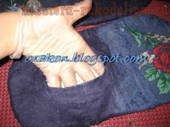 После того, как тапочки полусваляны (шерстка уже заватывается отдельными волосками), делаем разрез для ноги. Моя мама любит очень плотно сидящие тапки, которые с трудом одеваются на ножки, поэтому размер делаю максимально маленьким. отя и маленький разрез потом можно растянуть до огромного))) Для разреза делаю точки на расстоянии примерно 6 пальцев от края, и 10 см длиной, потом немного срезаю по края (округляю) 0 максимум по 1,5 см с каждой стороны разреза. Разрез важно делать тонкими ножницами без заусенок на лезвиях. Потом аккуратно тянем наш разрез вдоль и в стороны, чтобы растянуть его.