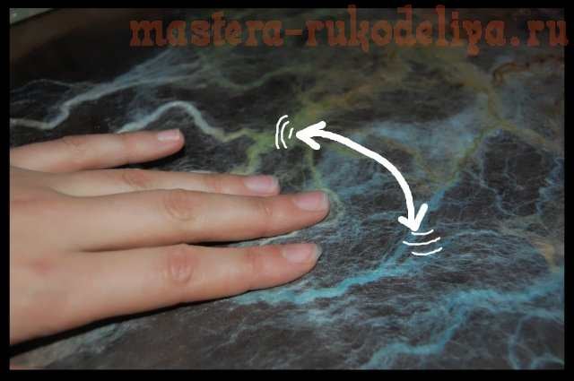Берем линейку и отмериваем пару сантиметров от края.Если делать обычную раскладку, то шелк, не закрытый шерстью будет волнистый,как бы в рюшечку,но так как у нас усадка маленькая, я делаю это просто для красоты.Далее начинаем раскладывать шерсть.