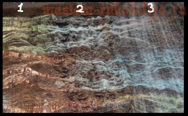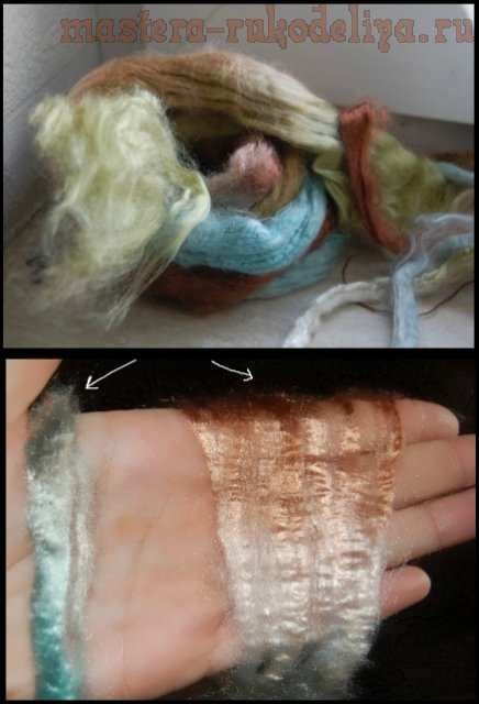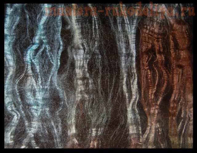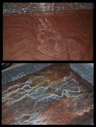 Что такое Армирование?По сути это прием, благодаря которому достигается маленькая усадка шерсти,из-за того , что поверх (или с обеих сторон) кладутся волокна(шелк, вискоза). Волокна сами по себе не усаживаются,но приваливаются к шерсти, а так как шерсть садится,она стягивает волокна образуя из прямых волокон волнистые. Когда же волокон много (во всю длину), они приваливаются, но уже не дают шерсти настолько сесть в процессе валяния.