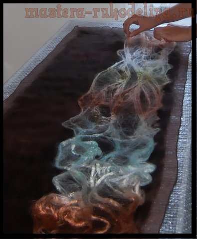 Берем шелк или вискозу. В данном случае у меня вискоза,которая покрашена сигментами. Отделяем тоненькую прядочку,равную длине раскладки шерсти (Палантин 180 см минус кант, значит около 170).Я кладу вискозу на сухую шерсть.Это не правило, просто мне так удобнее