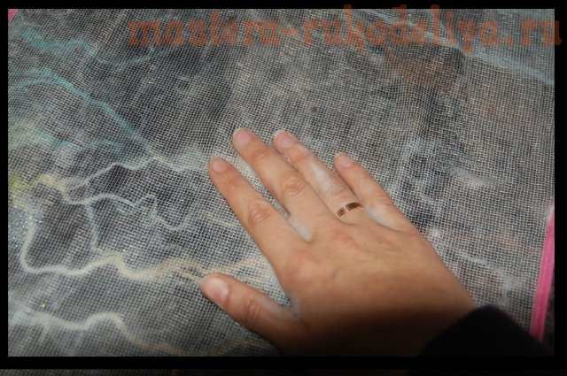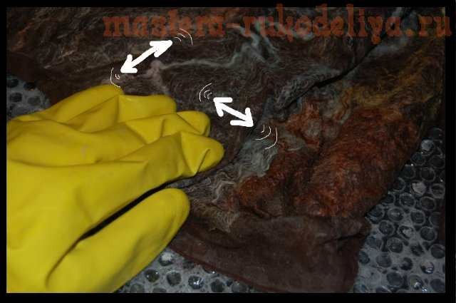 После того, как вы намочили весь шарф можно начать его валять. На этом этапе можно воспользоваться ВШМ, но я работаю руками. Беру сеточку кладу ее и начинаю по минутке тереть через нее шарф. Если руки плохо скользят, значит нужно добавить еще мыла. Через минуту переходим на другое место, чтоб сеточка не привалялась к шерсти.