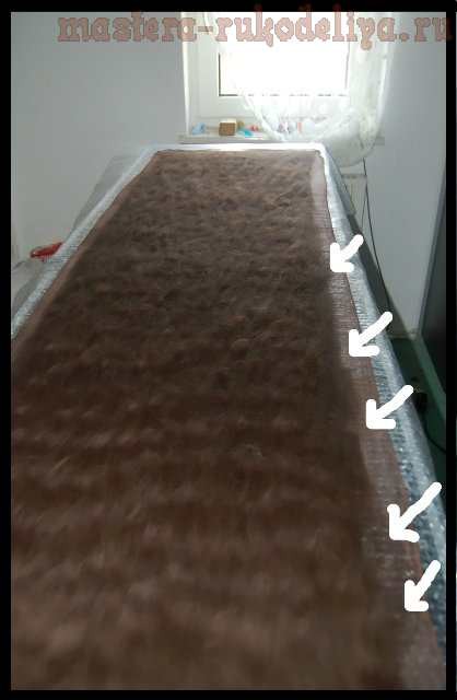 Выкладываем 1 Горизонтальный слой.Затем проходим с линеечкой и смотрим, везде ли у нас шелковый кант одинаковой ширины. Где нужно прибавляем прядочки. На фото указаны места, куда надо доложить прядки шерсти.