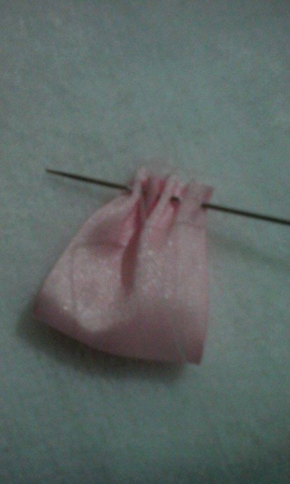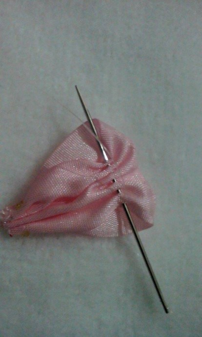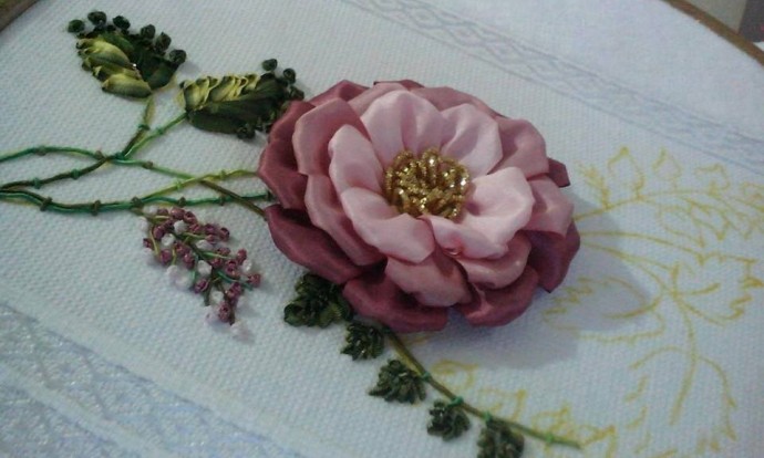 Двухцветный цветок из атласных лент может быть частью более масштабной вышивки.