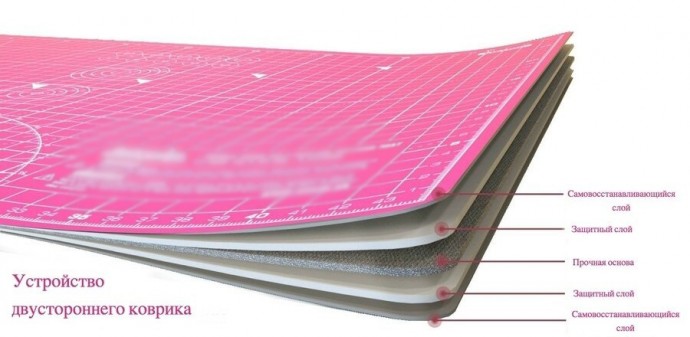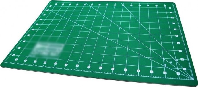 Коврики-подложки (ещё их называют матами для резки) имеют плотную прочную основу, которую невозможно проткнуть шилом или разрезать даже острым скальпелем, поэтому он спасёт ваш стол от повреждений. Сверху же у коврика — более мягкий слой из особого упругого материала вроде резины. Ткань, кожа, бумага не будут скользить по такой поверхности, а нанесённая на мат разметка поможет в построении выкроек, вычерчивании деталей и крое. У большинства хороших ковриков верхний упругий слой обладает функцией «самовосстановления»: сделанный на нём разрез довольно быстро «затягивается» и исчезает.
