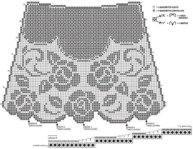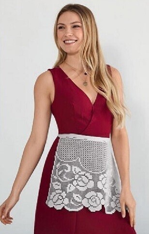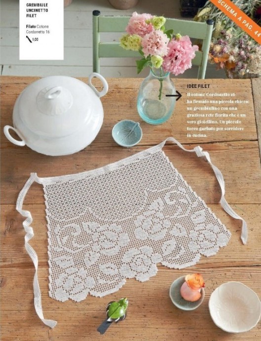 Фартучек, выполненный филейным вязанием, больше украсит хозяйку, чем защитит от брызг.