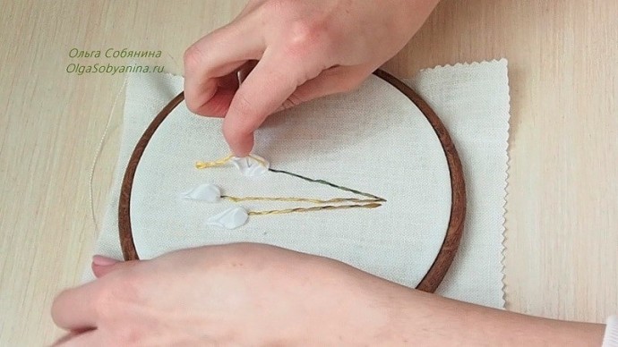 В первую очередь, необходимо вышить стебельки цветков. Вывести ленту на лицевую сторону, скрутить и проколоть ткань чуть дальше. Так вышить 3 стебелька. Зафиксировать их ниткой в цвет ткани. Далее можно приступать к вышивке бутонов.