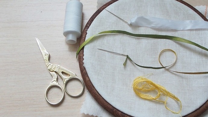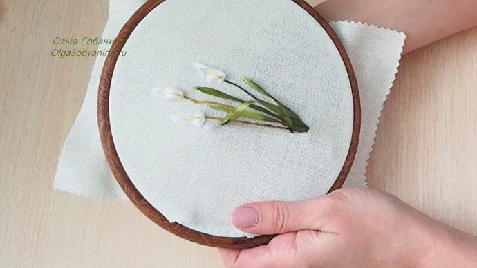 Листья вышиваются зеленой лентой, шириной 4−6 мм. Используя 2 вида швов: прямой и с проколом, можно создать красивую зелень. Вышивая композиции на светлой ткани, не стоит делать длинных протяжек на изнанке, чтобы работа смотрелась аккуратно.