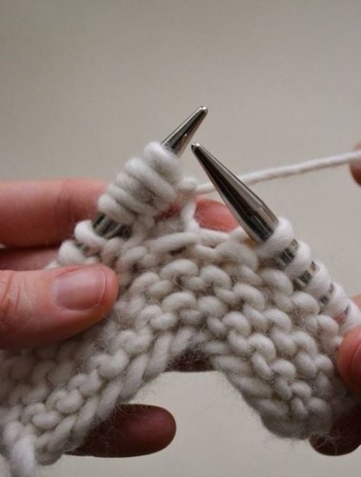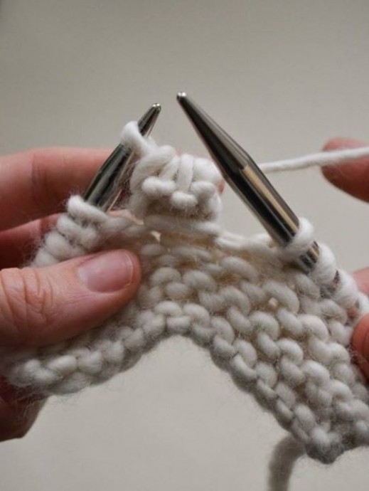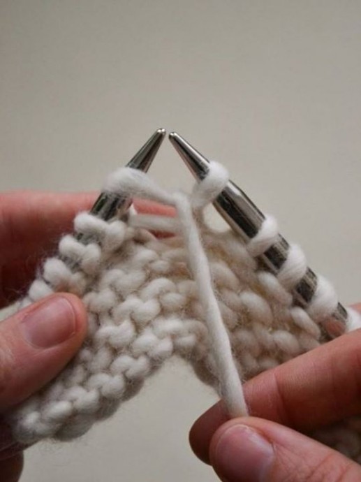 Шаг 1. Там, где у вас лицевая сторона вязания, разметьте, где вы хотите вывязать шишечку. Из одной петли необходимо вывязать 5 новых петель путем их перекидывания на левую спицу (3 раза: провязать лицевую — перекинули на левую спицу — провязали лицевую — вернули на правую спицу — все 5 петель должны вернуться на правую спицу), чтобы не получилась одна большая дырка. У вас получилось 5 петель из одной петли.
